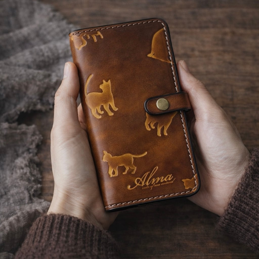オリジナルのイラストを彫刻し、アンティーク染色を施した遊び心あるスマートフォンケースになります。